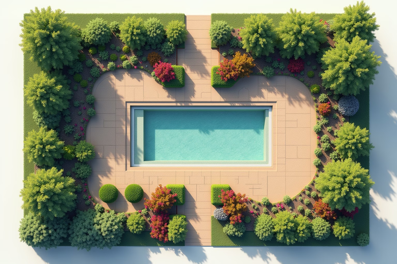 Diese Idee kombiniert verschiedene Elemente zu einem harmonischen Ganzen. Der Grundriss integriert gezielt Wasserflächen wie einen kleinen Teich, einen Bachlauf oder sogar einen Schwimmteich, die sowohl optisch als auch klimatisch eine Bereicherung darstellen. Daneben werden verschiedene Sitzbereiche geschaffen – von einer sonnigen Terrasse bis zu einer schattigen Sitzecke unter einem Baum. Klare Wege verbinden diese Bereiche und definieren die Übergänge. Diese Idee eignet sich gut für mittelgroße bis große Gärten und bietet eine hohe Nutzungsdichte.