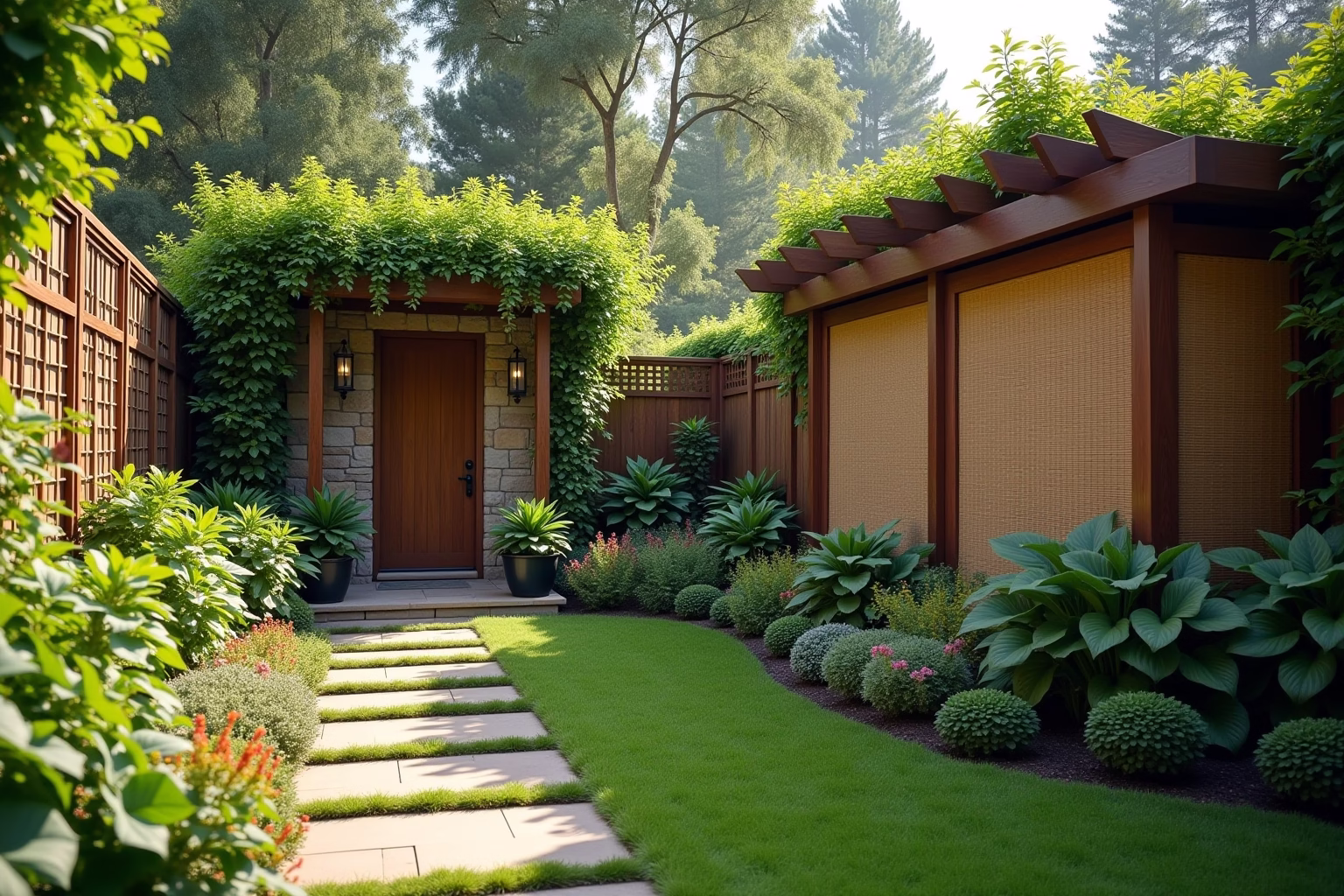 - Bambus: Schnell wachsend, immergrün. Wichtig: Wurzelsperre verwenden, um unkontrolliertes Ausbreiten zu verhindern.